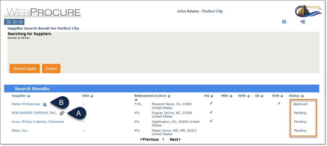 Exported Vendors - The same suppliers that appeared on the Search Results page will be listed with all their associated information including contact and status information, etc. View sample image.