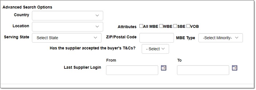 For those buying organizations that utilize Buyer Custom Fields, this section, once expanded, will display those fields that may be used to search for a specific supplier.